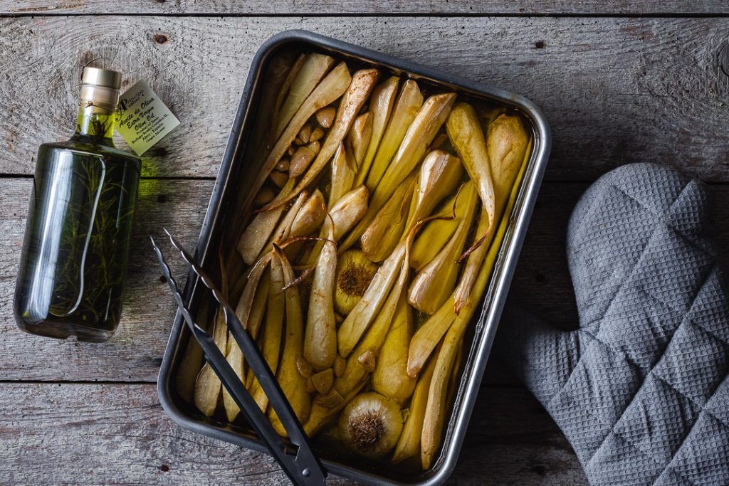- Într-o tavă înaltă de 20x30cm se pun legumele (usturoiul cu partea tăiată în jos) peste care se adaugă sarea și uleiul. Se dă tava la cuptor pentru 60-70 minute sau până când o furculiță intră ușor în păstârnac, întorcându-i la jumătatea duratei.