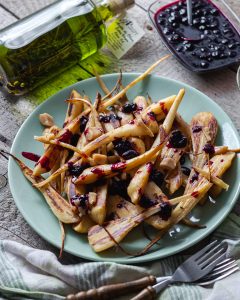 Iată cum o rădăcinoasă simplă și adesea trecută cu vederea ca păstârnacul, poate să devină ceva fin și delicios cu ajutorul unui ingredient special cum este uleiul de măsline cu rozmarin și piper. Textura cremoasă și dulceața legumelor este echilibrată perfect de sosul acrișor de coacăze, făcând acest confit potrivit nu numai pe post de garnitură, dar și pentru a fi consumat ca atare.
